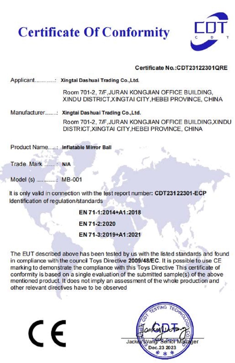 Mainly made of double-layer durable PVC material, the surface is specially treated to form a mirror effect, which can reflect the surrounding light and create a fantastic visual effect. This sphere is not only lightweight, easy to transport and install, but also durable and suitable for a variety of outdoor and indoor environments. In addition, the mirror ball has a variety of colors and can be customized with different colors or patterns according to the theme of the event to meet the needs of different customers.