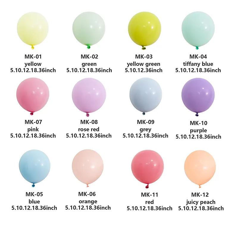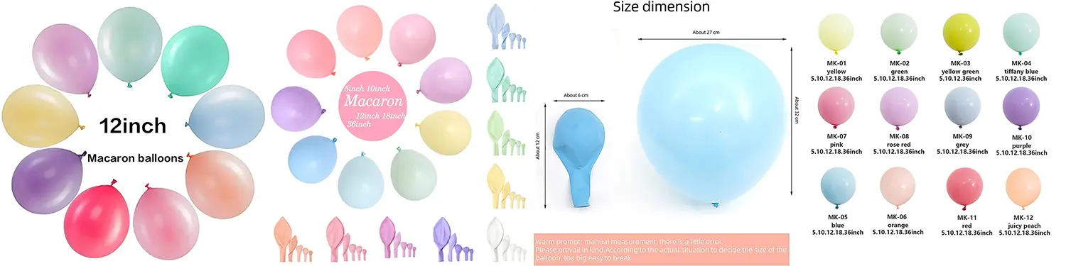 Strict production: Efficient production line combined with strict quality inspection (ISO 9001 certified factory), all 12 inch macaron latex balloons have undergone multiple experimental tests to ensure uniform thickness (0.25-0.28 mm), no defects, and the burst rate (<0.01%) is far lower than the industry standard.