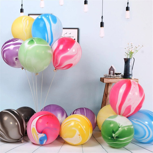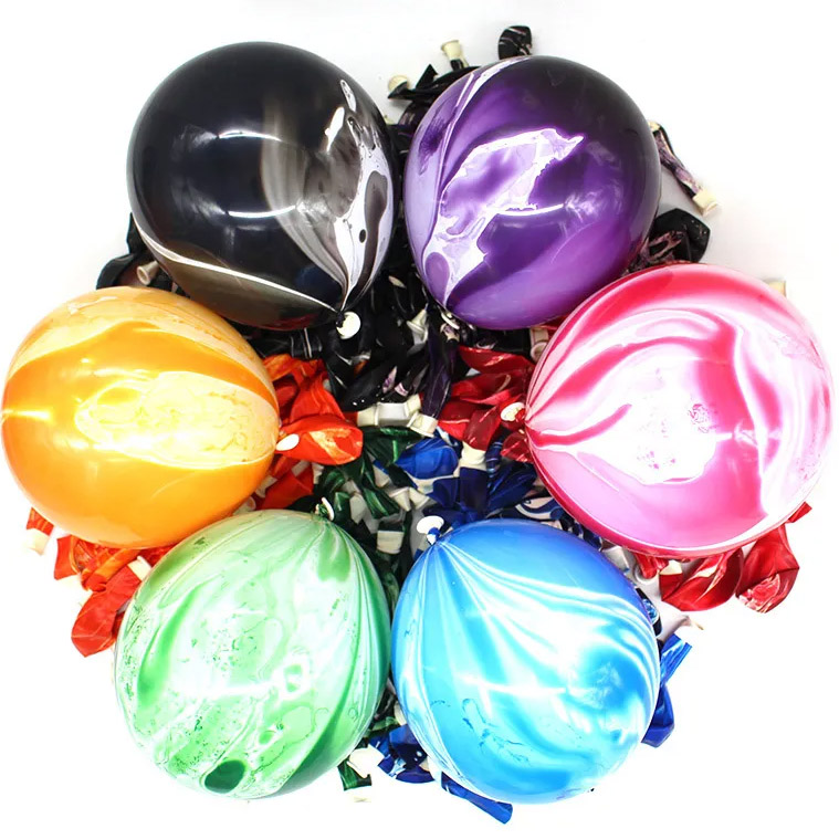 The agate latex balloon produced by the NiuN® Balloon Factory is made of high-quality latex, which is durable and beautiful, has no special smell, and is safer to use, so family and friends are more assured to use. The latex balloon is easy to tie, can maintain the inflated state for a long time, and is not easy to burst. This agate latex balloon is available in 7 colors, which are mixed color, black, red, purple, blue, green and yellow, and the sizes are 10 inches and 12 inches. We produce 100 pieces agate latex balloons in a bag. If you have other quantity requirements, we can also adjust the quantity of each bag of agate balloons for you. Marble agate latex balloons are the most common balloons and can be used for many decorative occasions to add a joyous atmosphere to your party.