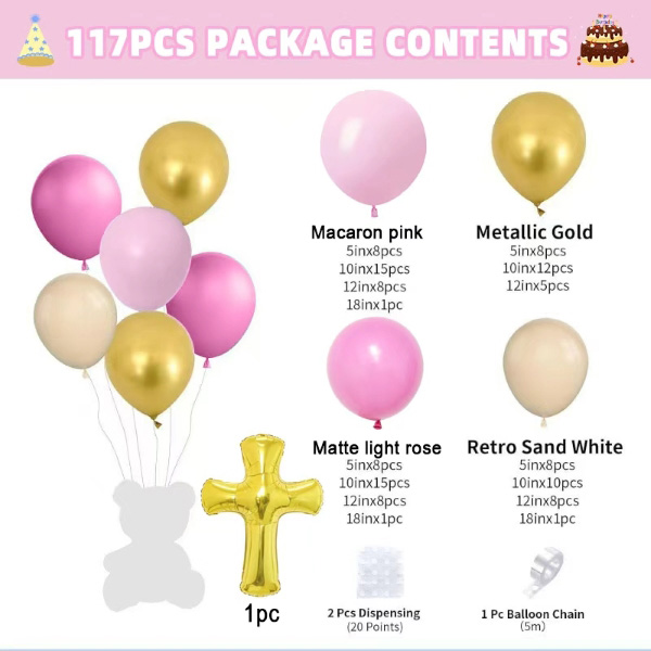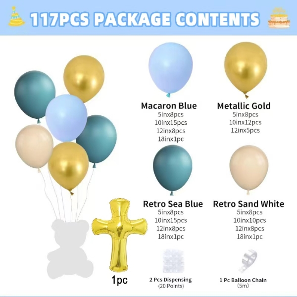 The baby shower balloon arch kits have two styles, one style is for baby girls and one style is for baby boys. The baby girl set is made of macaron pink color balloon, matte light rose color balloon, matte light skin color balloon, metallic gold color balloon and a gold god bless cross. The baby boy set is made of macaron blue color balloon, retro sea blue color balloon, matte light skin color balloon, metallic gold color balloon and a gold god bless cross. Both of them have the glue dot and balloon trip, you can use them to make a whole pretty garland.