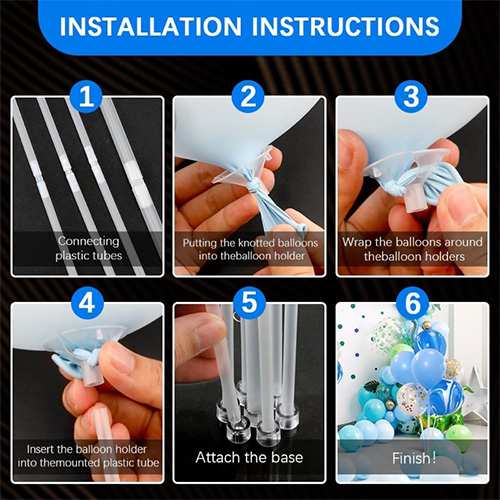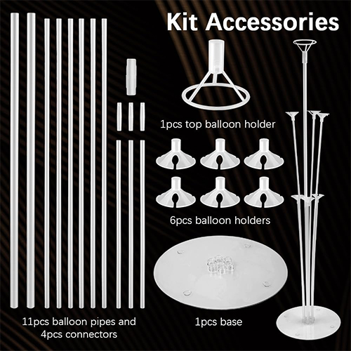 The balloon floor stand consists of a base, several cups, plastic pipes of different lengths, joints and a top gas club. After assembly, the balloon can be fixed to create a desktop or ground balloon decoration model, suitable for party, wedding, celebration and other scene layout. Balloon stand is convenient to build three-dimensional and beautiful balloon suit.