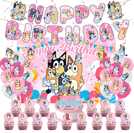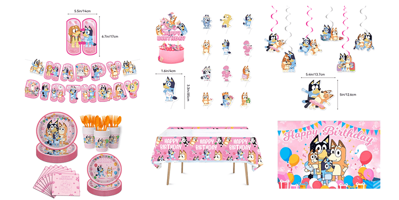 Bluey balloons accessories has a rich variety of categories, style unified design, to provide customers with one-stop party decoration solutions. With many years of sales experience in party supplies, we have produced many kinds of bluey theme balloon accessories such as paper banners, topper and tableware, which are perfectly matched with bluey balloons and meet the decoration and use requirements of various party scenes.