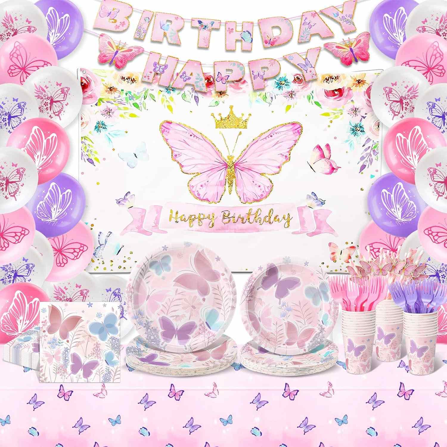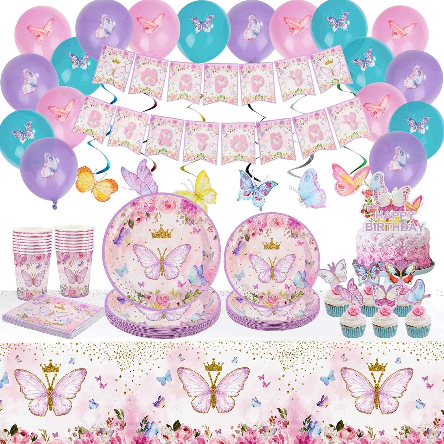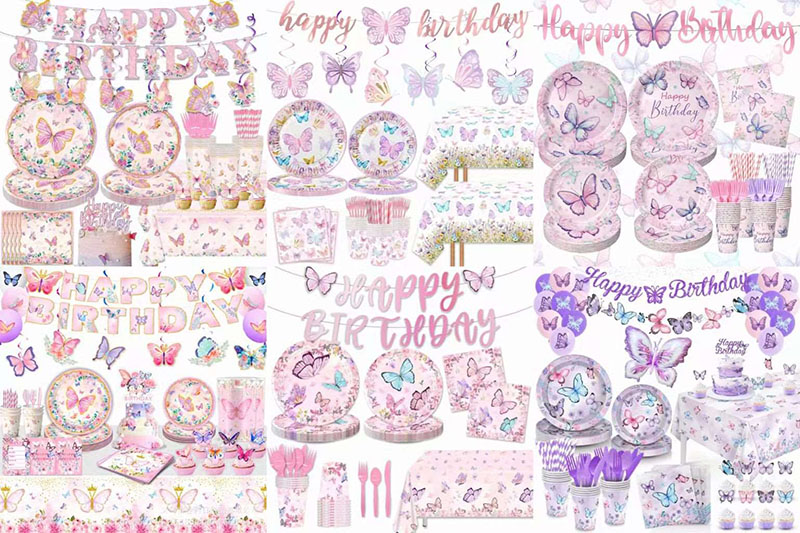 An excellent option for party decor is the butterfly party tableware set. Included are napkins, paper plates, paper cups, forks, and knives. Each piece shows butterflies parts.