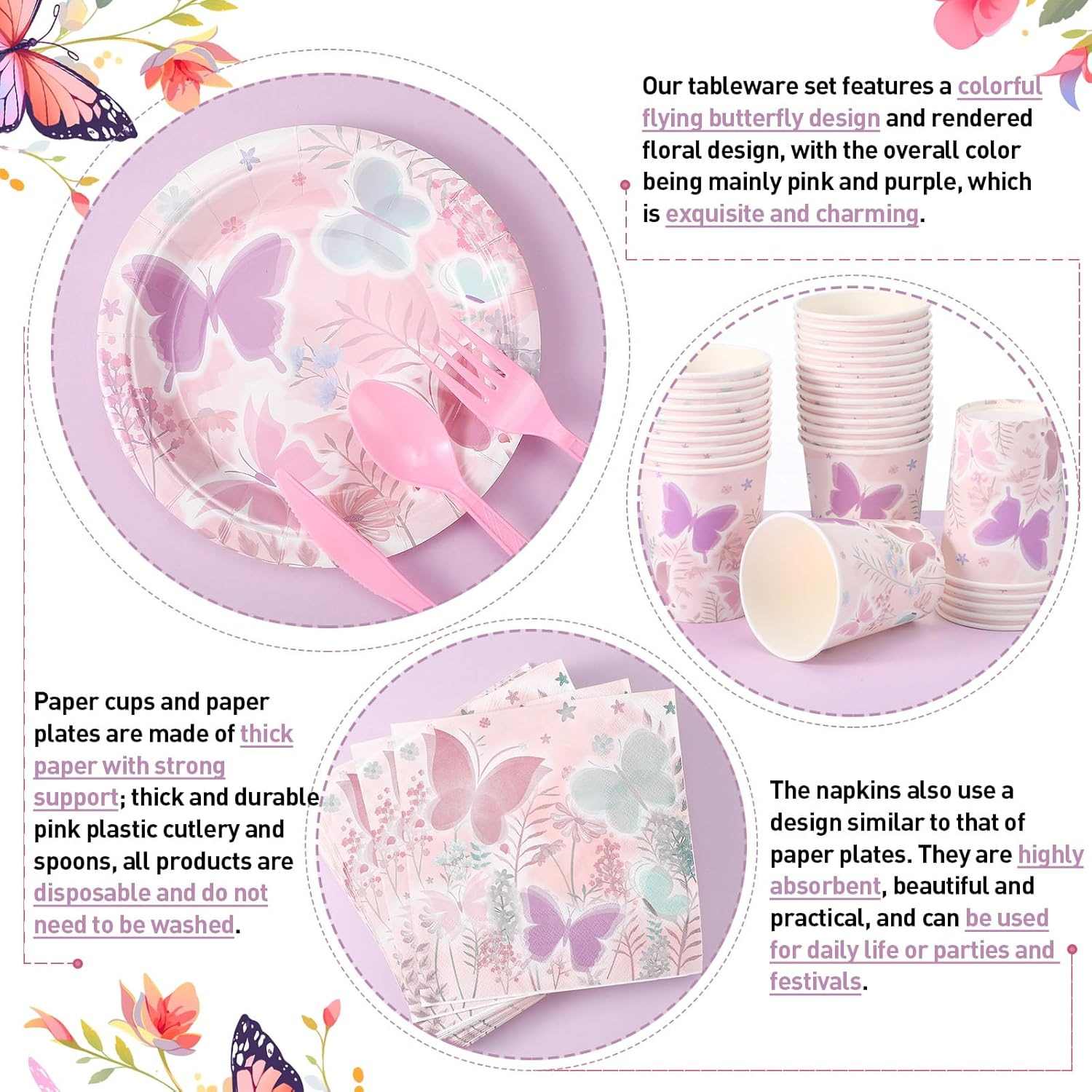 Napkins have the same style as the theme. They show pretty butterflies and flowers. The paper feels thick and soft. It takes in water well. It works for cleaning during meals. It can also be a small table detail that makes the party look nice.