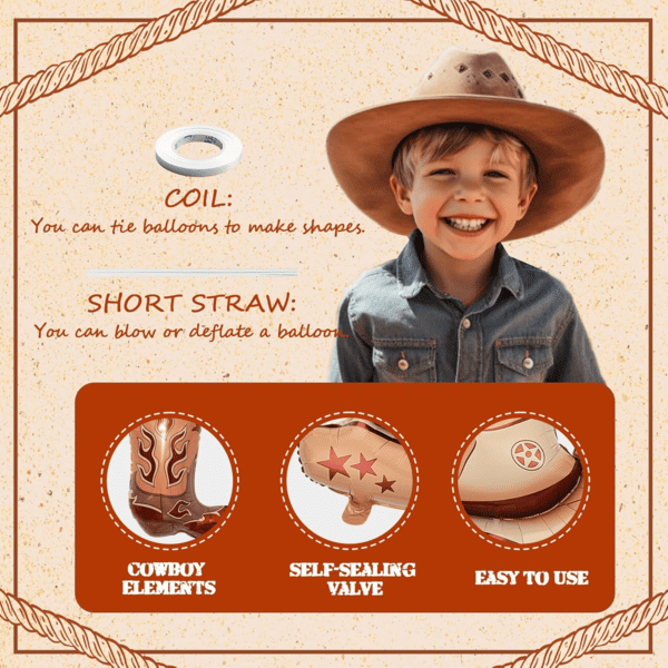 Cowboy foil balloons with helium:Fill cowboy foil balloons and related latex balloons with helium, they will keep the floated up effect. Whether placed in the store or displayed on the street, it can attract everyone's attention. The handsome horse foil balloons, the cowboy hat foil balloons with a wide brim, and the cowboy boot foil balloons burning with flames - all of them are simply irresistible.