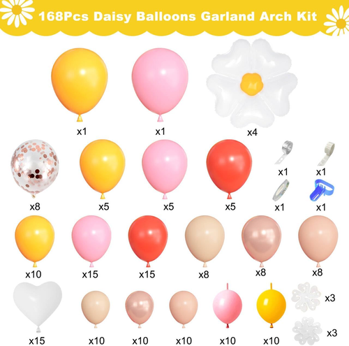 The balloons in the daisy balloon garland arch kit is about 150pcs, and can custom the specific quantity according to your needs. No matter what kinds of balloons you want to add, we will give you the best.