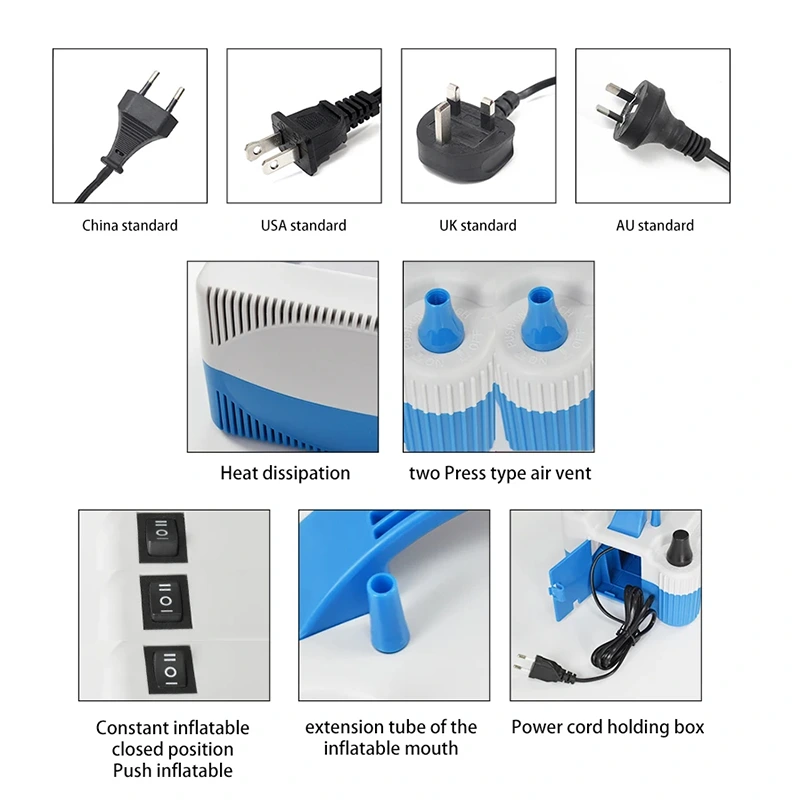 During the European and American holiday season (Halloween, Christmas) : The owner of an American party supplies store said, "Just plug in a 120V household socket, no need to look for extension cords or adapters. You can inflate 500 small balloons in 30 minutes by setting up a stall, which is three times faster than hiring workers." A German wedding company purchased a batch of European standard electric balloon pump. They filled 36 inch foil balloons at an outdoor wedding in Berlin and worked continuously for 4 hours without power failure. They said, "The quality of this pump is stable. We made the right purchase."