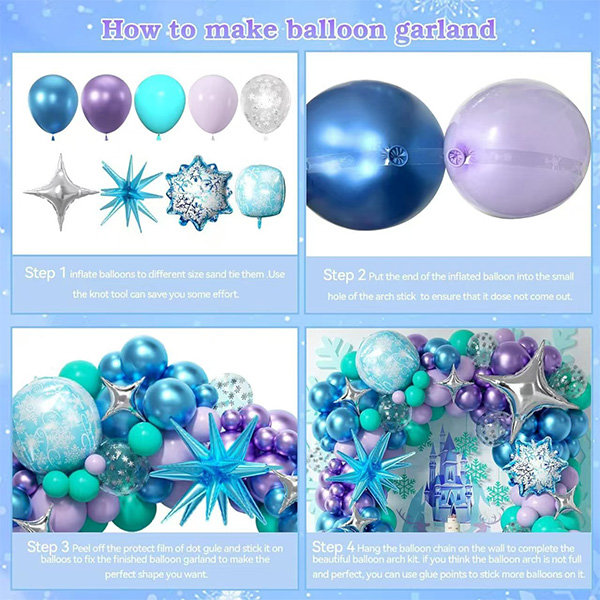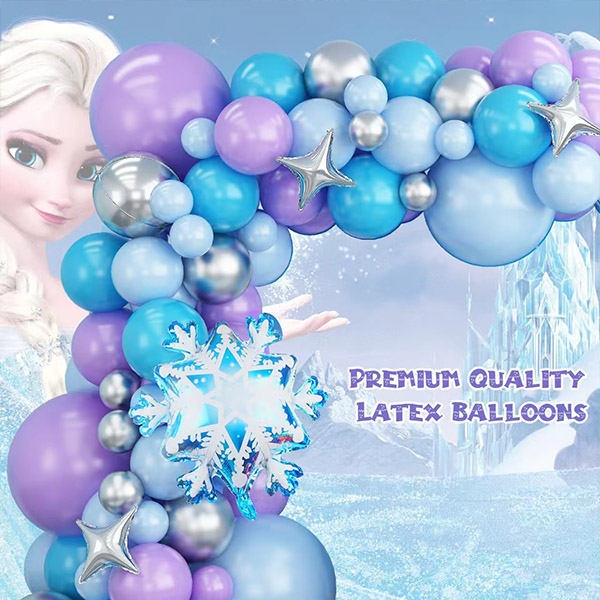 Frozen party decorations balloon garland kit takes inspiration from the popular Frozen IP. It accurately reproduces the colors from the movie. It combines cool colors like blue, silver , purple and white. The blue is like the early morning sky of Arendelle. The light purple is like the glow refracted by magical ice crystals. The silver decorations are like the reflection of snowflakes. They build a color system with rich layers. They create a dreamy and elegant visual experience.