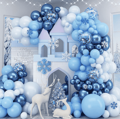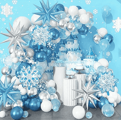 3.Frozen balloon garland kits usually contain various sizes of frozen balloons, unique foil balloons, matching decorative ribbons, inflators, unmarked glue spots, installation ties and other accessories to meet the layout requirements in one stop. All components are made of safe and environmentally friendly materials, fully adapted to children's activity scenes. The balloon pattern in the suit is carefully matched, combining the classic character image of Frozen with the dreamy ice and snow elements. The colors are blue, white and silver, creating a pure and romantic magic atmosphere.