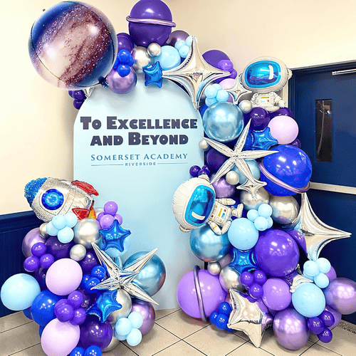Galaxy theme balloon garland comes with high quality latex balloons and foil balloons. The colors of the balloons are purple pink blue and sliver, which is the symbolize of the galaxy. This package is highly favored by many people, including astronomy enthusiasts and space enthusiasts. Therefore, it can bring about excellent sales results for your business.