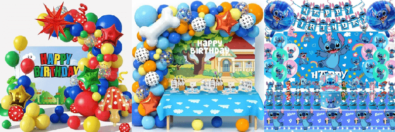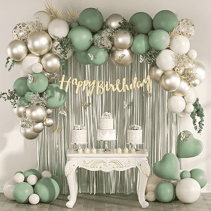 This style of happy birthday balloon decoration set combines latex balloons,foil balloons with backdrop and tablecloth to create an immersive birthday party scene through color unification. The backdrop and tablecloth can be customized according to the size of the scene, and the style and pattern can be customized according to the party theme and color system.