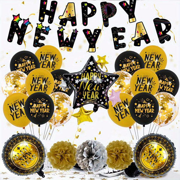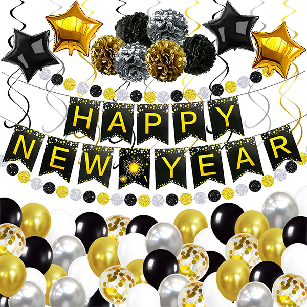 A: The Happy New Year decorations are versatile and can be enjoyed by all age groups, from children to adults. The festive design and color scheme appeal to different generations, making it perfect for family gatherings, friends' parties, or even office celebrations. For example, kids might enjoy the colorful pom poms, while adults will appreciate the elegant black and gold designs.
