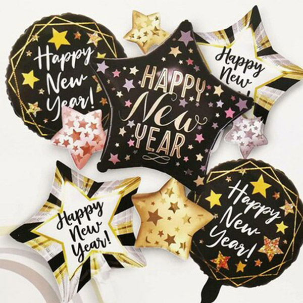 HAPPY NEW YEAR FOIL BALLOONS feature star-shaped, round aluminum foil balloons. Their unique design and adorable appearance will make your party more fun and create a memorable and impressive New Year decoration experience. Made from high-quality aluminum foil, these balloons are durable, leak-resistant, and stay full for extended periods. They can be inflated with air or helium, maintaining a full, three-dimensional shape. They're perfect for indoor and outdoor decorations. We also offer customized New Year foil balloons, allowing you to tailor them to your style to meet all your needs.