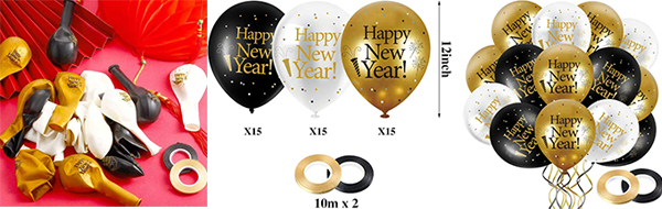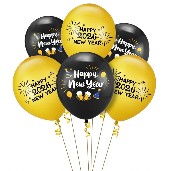 New Year themed latex balls are decorative balloons available in sets, featuring New Year designs like "Happy New Year" or festive colors like black, gold, and silver. They're perfect for parties and can be used to create balloon arches, bouquets, or hung from the ceiling. All New Year-themed latex balls offered by Borun Balloon Factory are made entirely of latex and meet the Happy New Party Latex Balloons CE certification. The niun brand supports wholesale sales of these New Year themed latex balloons. These Happy New Year latex balls are both practical and aesthetically pleasing, offering both cost-effective and creative design. They instantly elevate the festive atmosphere and bring warmth and joy to any celebration.