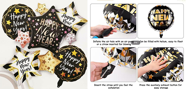 All Happy New Year foil balloons are helium-supported and reusable: The balloon set is helium-supported and is the perfect backdrop for New Year's Eve decorations. After inflation, simply pinch the opening of the mylar foil New Year balloon and the adhesive will automatically seal. It is easy to blow and seal, easy to inflate and deflate, and can float for a long time. You can place them at doorways or on ceilings and walls.