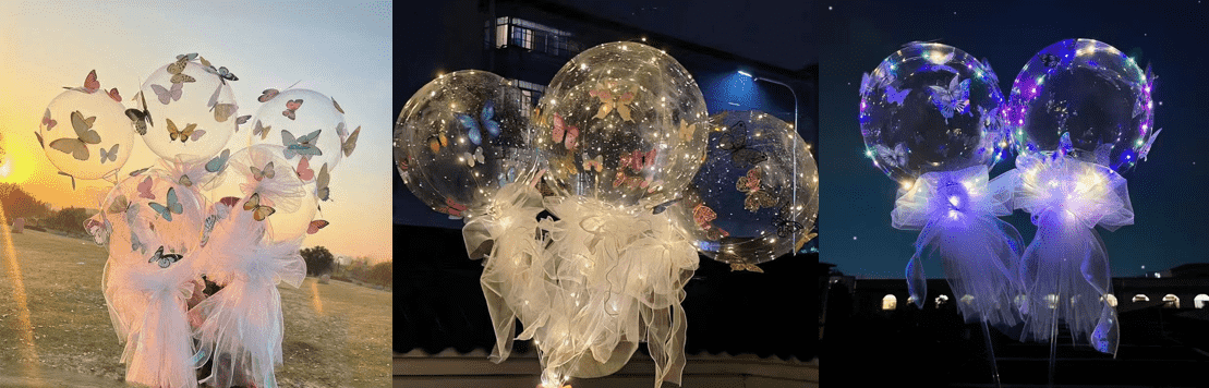 Bobo balloon itself is transparent and simple, which is highly consistent with the light-transmitting flexibility of the hollow butterfly sticker. The core use of the sticker is to upgrade the monotonous balloon to a butterfly dance suspension ball, and make the balloon the focus of the scene through the three-dimensional shape of the butterfly and the light and shadow effect. Children's birthday party, adult birthday party, wedding welcome area, shopping mall activities, holiday home decoration are very suitable. At night, it can also be matched with LED lights, which is very eye-catching.