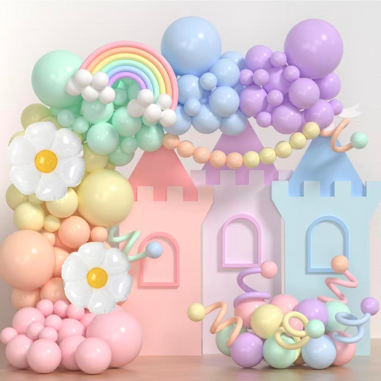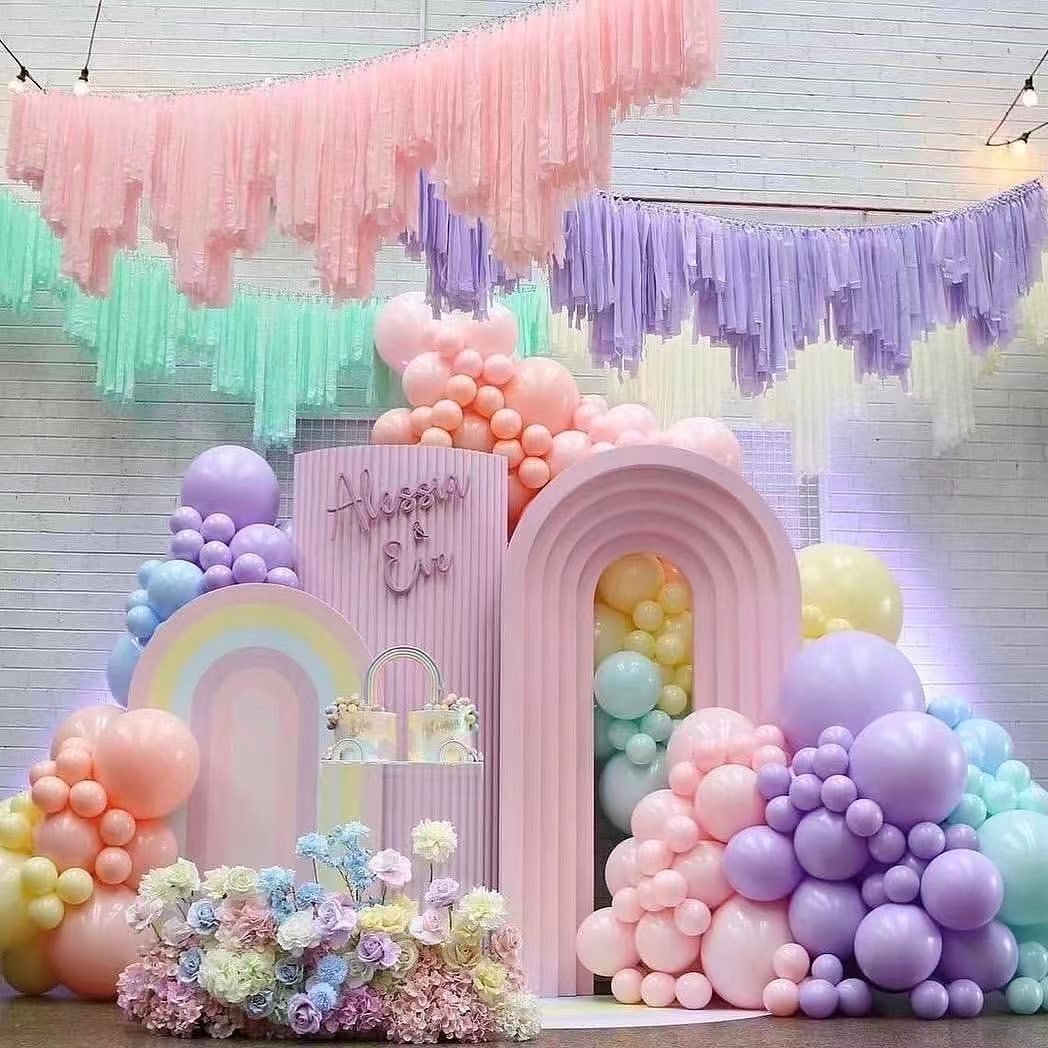 Macaroon colored balloons garland arch is popular for its soft and dreamy colors. The whole set focuses on 12 gentle macaroon colors. It has macaroon red, macaroon blue, macaroon purple, and other colors. Each color brings a fresh and romantic look.