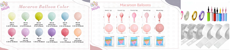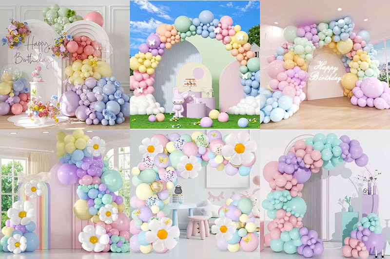 260 Modeling Balloons can decorate the macaroon balloons garland arch. You can weave or tie them. Modeling balloons can make flowers, rainbows, bows, and other shapes. They add fun and creativity to the garland. In kids’ parties, adding macaroon long balloons makes the atmosphere more lively and cute.