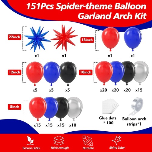 The main colors of the balloon set is blue,red and black. The distinctive three colors will make you imagine the cool figure of Spider-Man from the movie.The latex balloons in this set including matte red balloon,matte blue balloon, matte black balloon,metallic sliver balloon. The foil balloon in this set is explosion star foil balloon, the color is blue and red.