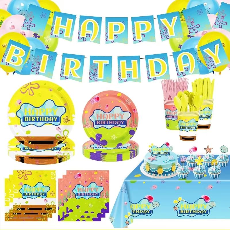 In kids’ party items, the SpongeBob tableware set is a fun and useful choice. It has famous characters like SpongeBob and Patrick as the main design. The set comes with plates, paper cups, napkins, and utensils. The plates show SpongeBob with a big smile and Patrick with a funny face. The design adds jellyfish, seaweed, and shells to bring a sea style. The colors are bright and rich in layers. The paper cups and napkins follow the same theme. The whole table looks full of ocean fun. The tableware uses safe and eco materials. It keeps a cute style and is also useful. It fits birthday parties, themed events, or family meals. The set makes a happy “Bikini Bottom feast” for kids and gives parents an easy and high-quality party option.