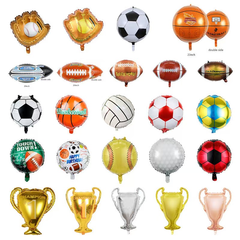 Sports theme balloon suit with dynamic competition, blood struggle as the core design concept, with bright colors, dynamic patterns to convey sports passion, so that activities are full of high-spirited atmosphere. Basketball, football, tennis and other individual sports themes or comprehensive sports party scenes can be decorated with balloons to create an immersive experience. According to the material characteristics and usage scenarios, it is divided into two categories: sports-themed latex balloons and foil balloons, which are suitable for different scale activities and layout requirements.