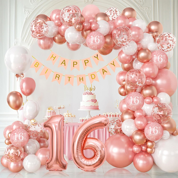Sweet 16 balloon arch this package includes latex balloons, foil balloons, birthday banners, glue spots, ribbons, etc. If you have special needs, we can also customize the balloon size, quantity, color, etc. within the package according to your requirements.