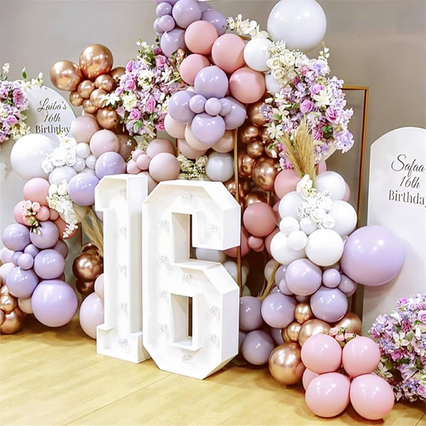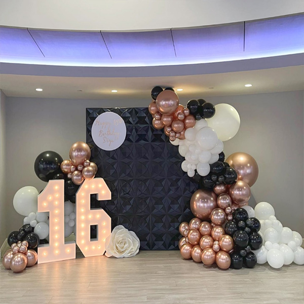 Balloon garland with 16 led light:Our factory also launched a balloon garland with 16 years old led light. The led number lights are made of environmentally friendly materials ABS and LED to provide bright and lasting lighting effects. LED lights with numbers and letters that can glow in the dark. The soft lighting creates a relaxed and comfortable atmosphere and adds a unique charm to any room. They can be displayed independently or hung on the wall, on the mantel or placed in the reception area for use during events or celebrations. LED number lights with balloon garland arches, suitable for creating an immersive party atmosphere, is an essential prop for taking unique and unforgettable photos, adding an unforgettable sense of ceremony to your 16th birthday.