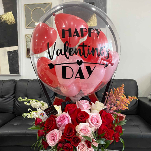 We have created a Valentine's Day bouquet bobo balloon in the shape of a hot air balloon with stickers on its body. You can match it with the balloon filling machine produced by our factory, put pink roses, eternal bouquets or lovely dolls into the balloon, and put romance and surprise into the gift box. As a Valentine's Day surprise gift for your partner or as a table decoration, this Valentine's Day bobo balloon is both a gift and a home decoration with a full sense of atmosphere.