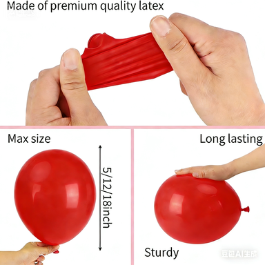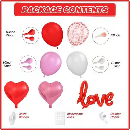 This balloons kit is mainly consist of latex balloons and several foil balloon. The latex balloons of them is of red, pink, white colors. They are made of 100% natural latex, which is totally eco-friendly and harmless for human body. And the size of them is also various. In order to set a beautiful layer, the latex balloon sizes are from 5 inch to 12 inch. Arrange them in the set is very easy, we also prepare the dot glue and balloon chain with it. So while arranging it, you can do it with flexibility.