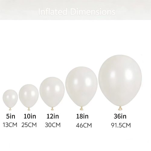 In-stock regular sizes of white pearl color balloons: 5,10,12,18,36 inches (round). Custom sizes from 10 to 36 inches are available, as well as custom heart-shaped pearl white balloons. MOQ can be negotiated.
